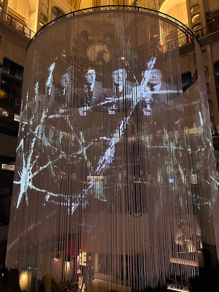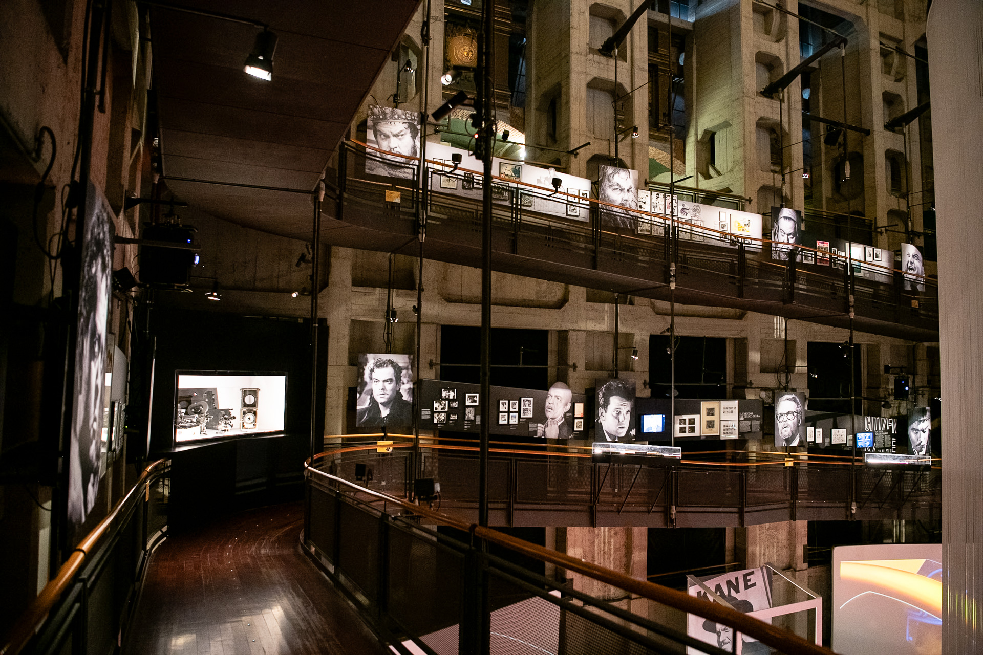 The exhibition begins in the Aula del Tempio (Temple Hall), where visitors are greeted by three tripoline screens suspended 18 metres above the ground around the panoramic elevator, highlighting the hypnotic dimension of the most cited sequence in the history of cinema: the mirror scene in The Lady from Shanghai. Also in the Temple Hall, there is an installation dedicated to Rosebud, that immerses visitors in the atmospheres of Citizen Kane, through the iconic snow globe.