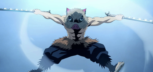 Nevertheless, a junior Slayer like Tanjiro Kamado always faces dire life-and-death stakes. By now, Kamado has developed great camaraderie with his slayer-friends, the nervous Zenitsu Agatsuma, and the brash, bare-chested Inosuke Hashibira, whose boar-head mask (a tribute to his wild upbringing) makes him standout quite dramatically. Like Kamado, they all experienced early childhood trauma, which led them to the Demon Slayer Corps. However, for this assignment, they accompany one of the Corps’ most powerful and prestigious Slayers, Kyojuro Rengoku, the “Flame Hashira,” one of their nine Hashira paragons of combat techniques.