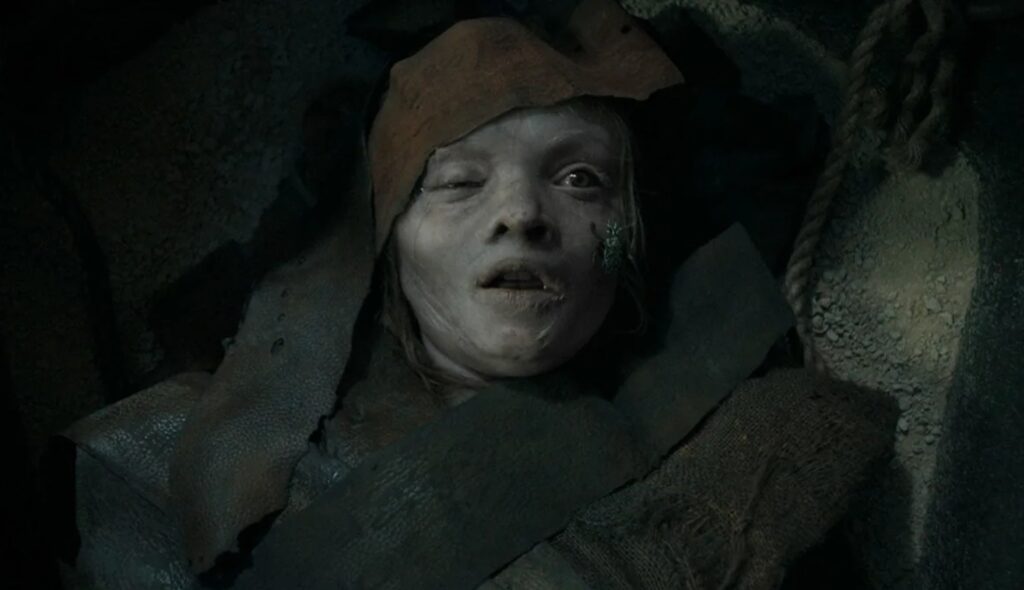 Instead of the zombie-like relentlessness of prior mummies, Cronin serves up demonic scares and a particularly gory variety of body horror. Frankly, if viewers are not wedded to the established ambiance and trappings expected of traditional mummy movies, Cronin’s Mummy is consistently grabby and often impressively scary. Regardless, it completely outclasses the Tom Cruise Mummy movie.