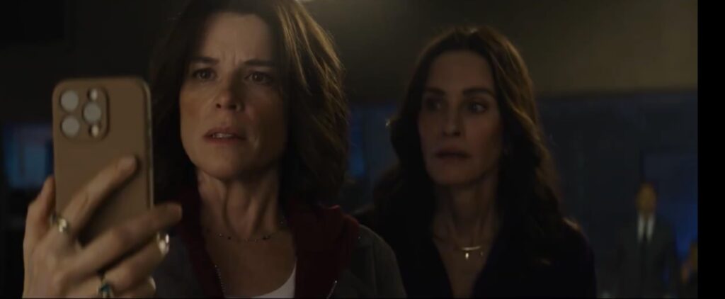 They represent positive additions, but most importantly, Campbell’s return brings back the fierce Sidney Prescott resilience fans have been missing. Frankly, her work in this film bears comparison with Jamie Leigh Curtis’s return as Laurie Strode in David Gordon Greene’s Halloween trilogy. She inspires instant audience confidence and provides a grounded, realistic center to the film. Likewise, Courteney Cox’s portrayal of Weathers remains as vain and sharp-elbowed, which is a very good thing. As usual, Cox gets some of the film’s best lines, which she fully capitalizes on. For further fan-service nostalgia, Matthw Lillard chews the scenery with maniacal delight as the Macher deep-fake—or maybe he truly is the real Macher.